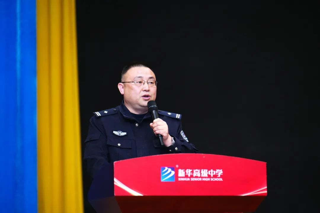 仪式伊始,新华高级中学党支部副书记、副校长吴东向在座师生介绍新任法治副校长——双墩派出所叶欣然警官。
