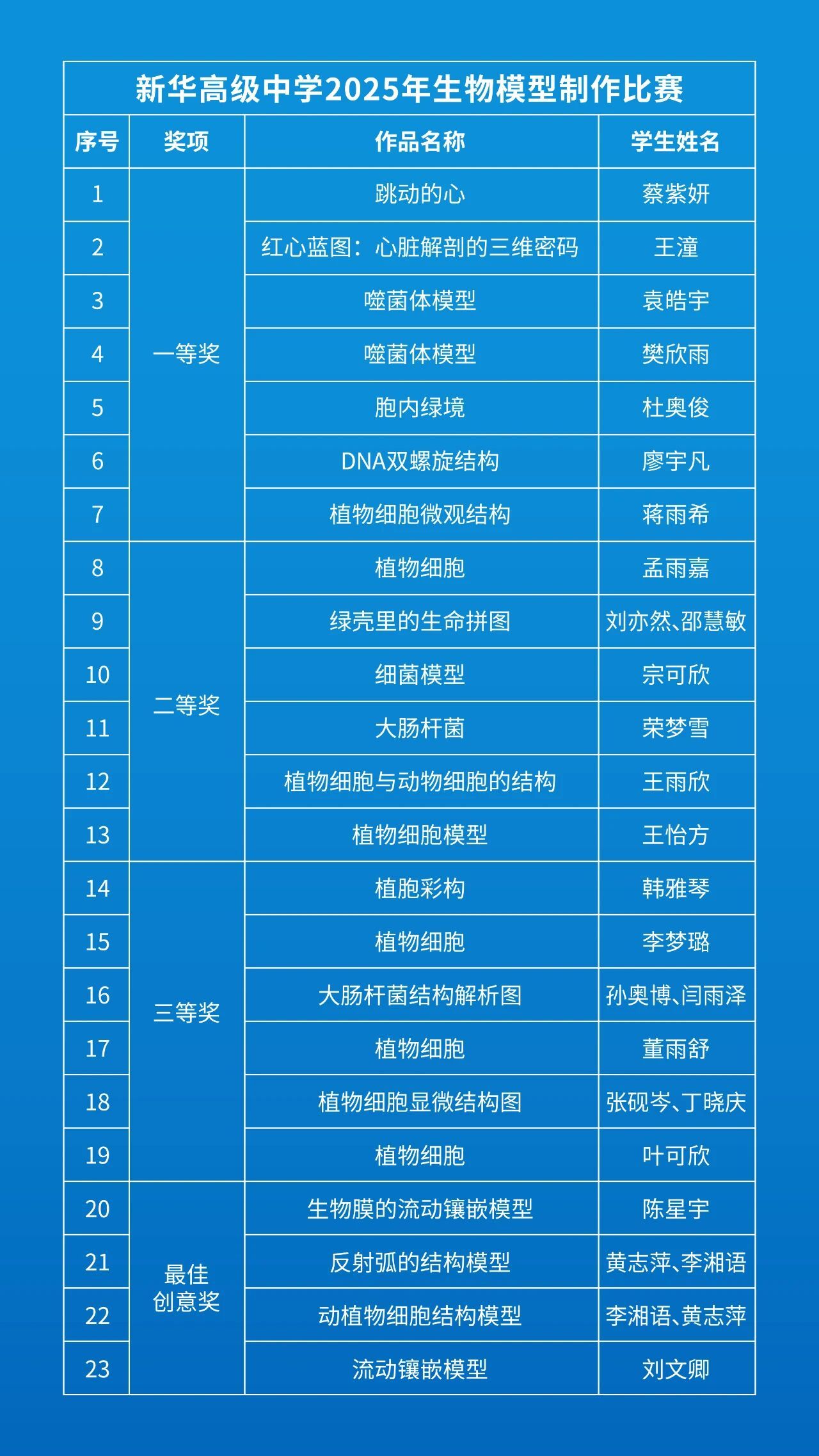 经过为期两周的创作与筛选,学校组织专业评审团队,从模型的科学性、准确性及创意性等维度进行严格评审,最终评选出 “生物创意奖” 一等奖7名、二等奖6名、三等奖6名、最佳创意奖4名。获奖作品中,既有精准还原植物细胞亚显微结构的立体模型,也有通过动态装置展示生态系统物质循环的创新设计,充分展现了新华高级中学学生扎实的生物学知识基础与出色的实践创新能力。