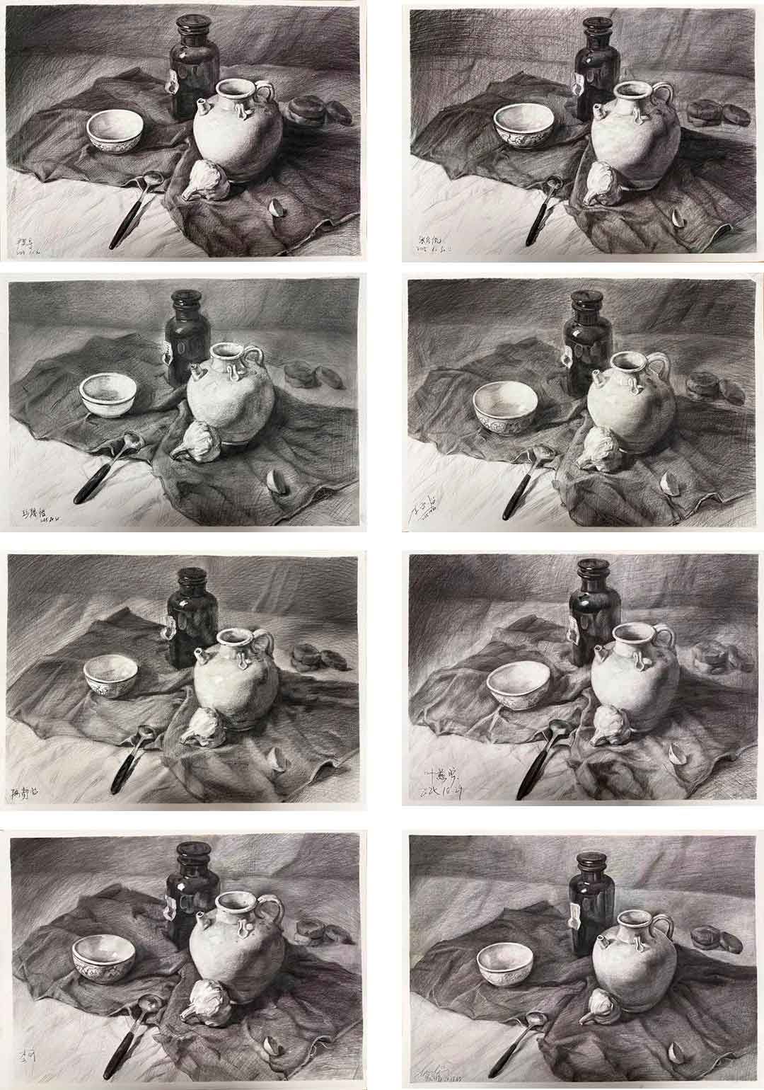 当铅笔与纸相遇,每一道线条都在诉说体积与光影的故事。陶罐的质感、玻璃的反光、布料的褶皱…… 在黑白灰的交织中,平凡静物被赋予了艺术的温度。这是素描的魅力,以最朴素的方式,捕捉形态与光影的极致美感,让我们在方寸之间,看见艺术的无限可能。