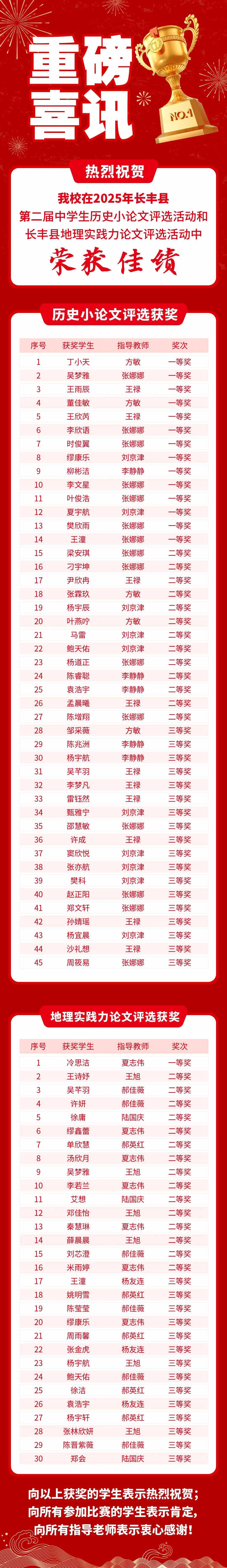 近日,2025年长丰县第二届中学生历史小论文评选活动与长丰县地理实践力论文评选活动结果相继揭晓,新华高级中学凭借扎实的学科教学功底与高效的师生协作,在两项赛事中均取得亮眼成绩,充分展现了学校在历史与地理学科教学中的突出实力。