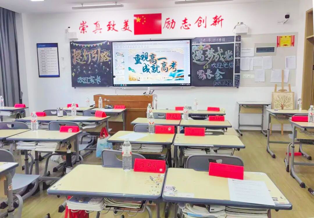 家长会当天,班级满是暖意。每张桌椅旁都整齐摆放着印着家长姓名的席卡与瓶装水,黑板绘着各类主题的暖心图案,励志条幅在墙边轻轻垂挂,搭配着学生笑脸照片与手写愿望的墙面,每一处细节都藏着班级的用心,用细致关怀传递对家长的尊重,更彰显家校携手的满满诚意。