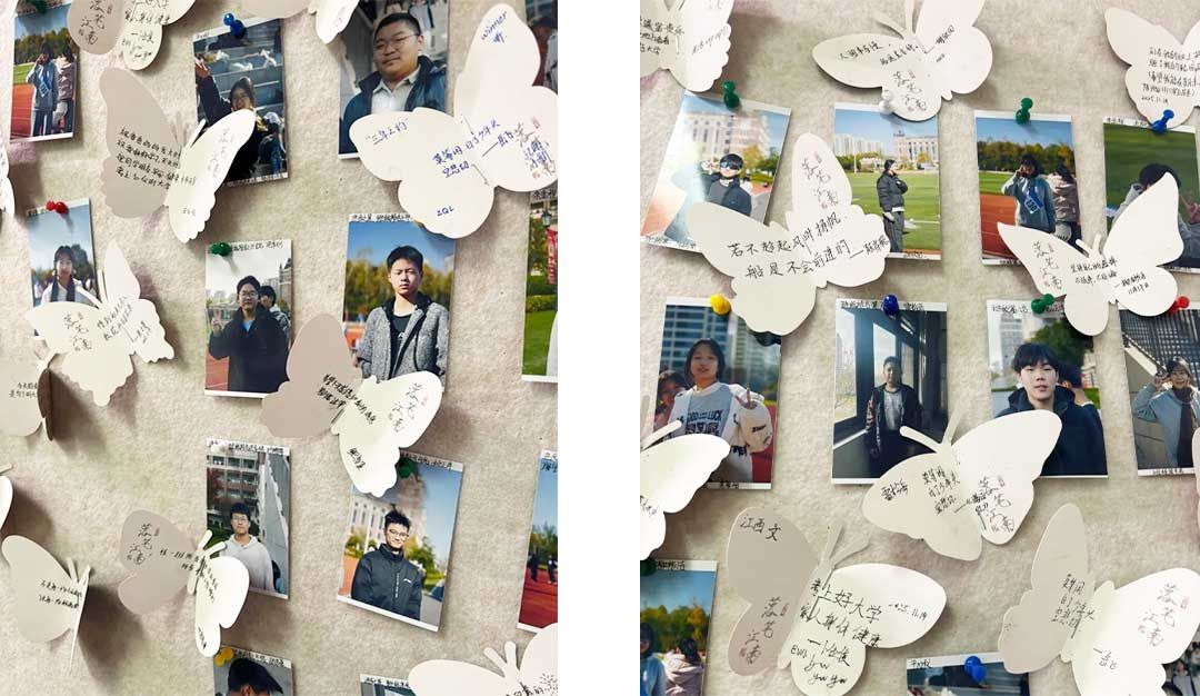 墙面上,一张张青春笑脸的照片定格着少年的鲜活模样,一个个稚嫩却坚定的手写愿望,藏着成长的热忱期许。照片映朝气,愿望载初心,这方小天地满是温暖,静静守护着每份青春的蓬勃与向往。