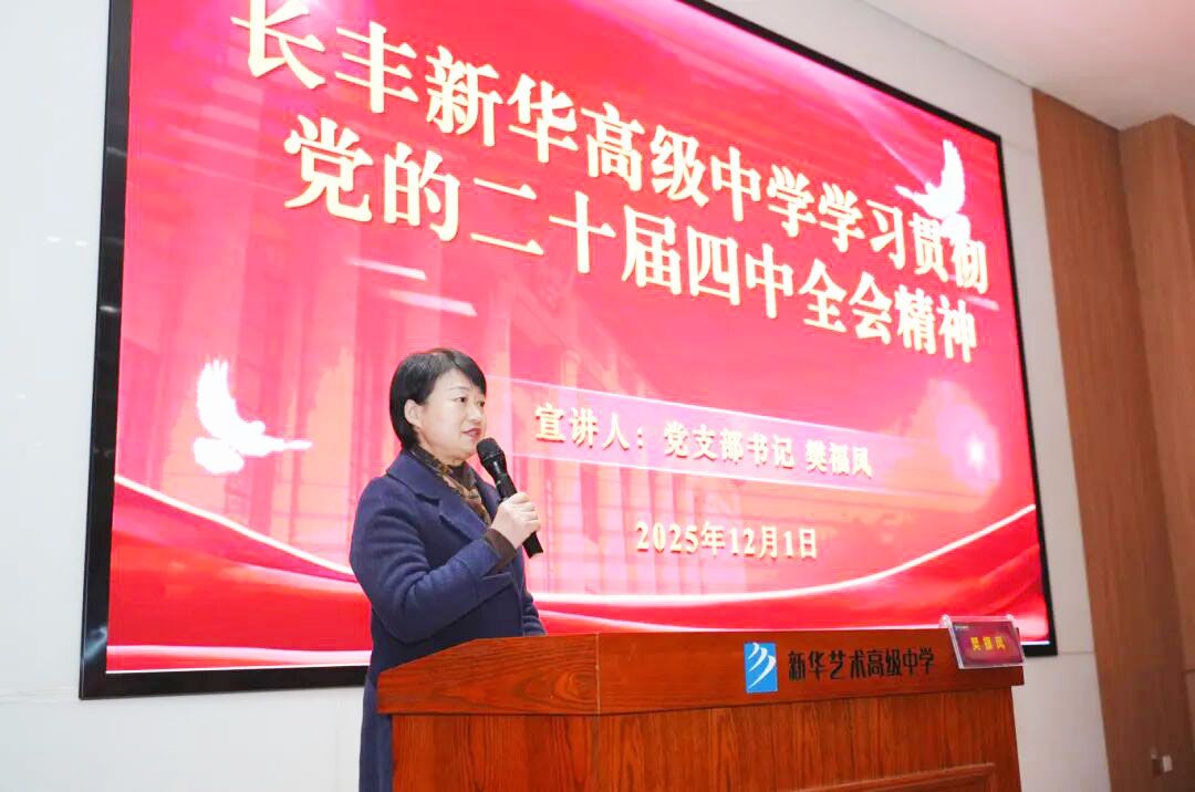 近日,长丰新华高级中学召开“学习贯彻党的二十届四中全会精神”专题宣讲会,组织全体教师学习党的二十届四中全会精神。党支部书记樊福凤宣讲。