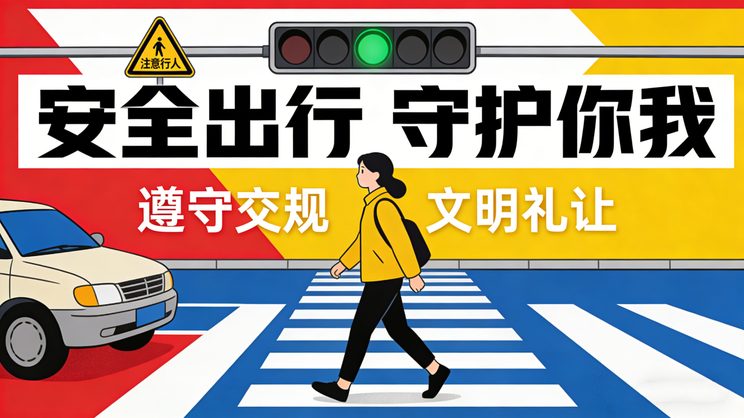 1.教育孩子遵守交通规则,红绿灯规则;行人走人行道,主动避让机动车辆;在没有人行横道的路段,确认安全的情况下才可以过马路。